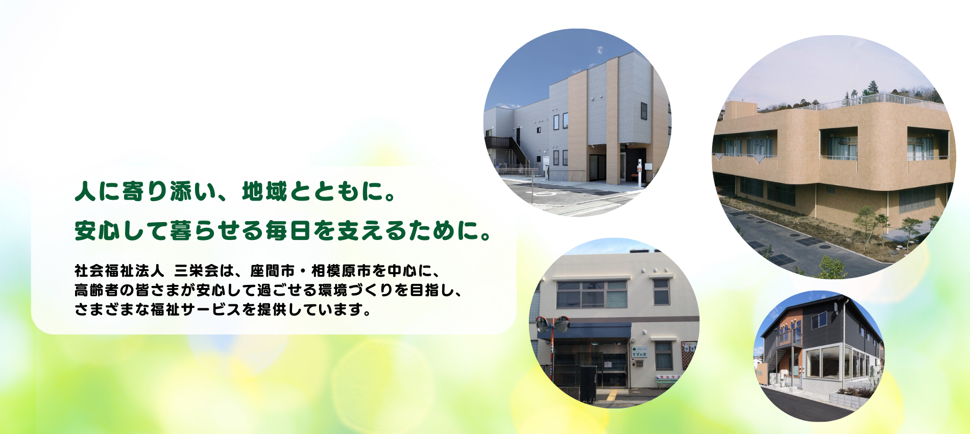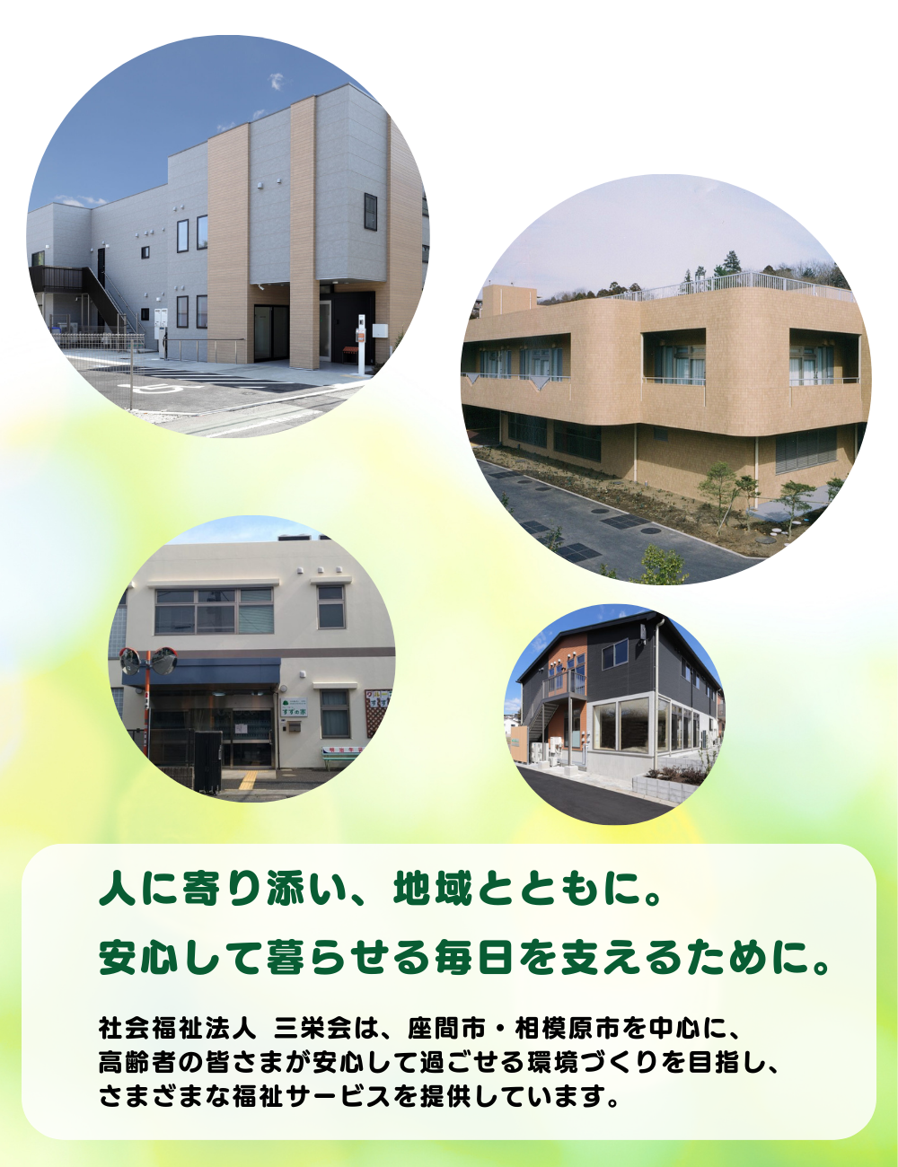 社会福祉法人 三栄会は「その人らしい暮らしを大切にする」ことを理念に、特別養護老人ホーム、ショートステイ、デイサービス、居宅介護支援、地域包括支援センター、そしてグループホーム「すずの家」シリーズを運営しています。